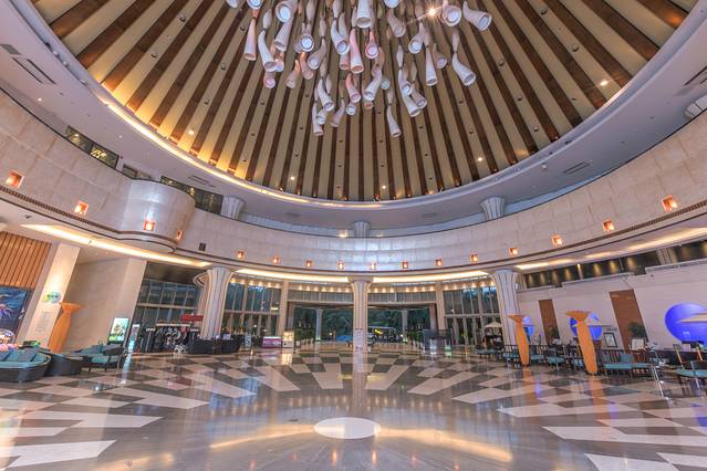 珊瑚酒店的大厅内部设计非常震撼,顶部以模拟各种贝壳的造型,穹窿式的顶部为大厅增添不少的气场。左右两侧分别是办理入住的前台、礼宾部以及大厅休息处。室内布局科学、合理且美观大方,山野君很喜欢这种格调。
