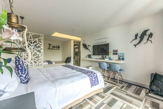 刚开始来三亚入住的普通标间,最后即将离开蜈支洲岛的时候还是选择这家。与起初入住的房型不太一样的是,这种观景套房面积更大、设计感更好,且观景更佳。山野君是跟同事一起来三亚参加潜水节活动的,最后一晚入住该客栈,体验感还是一如既往的好。