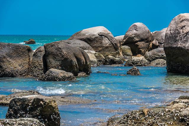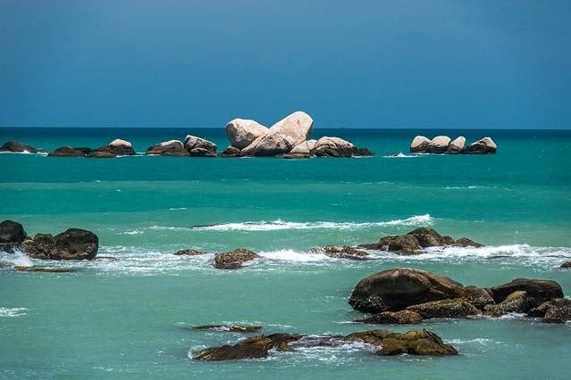 相比较蜈支洲、亚龙湾与海棠湾而言,天涯海角更具原生态,毫无规律的散落在沙滩上的石头形成最美的风光。乌黑色的石头与深蓝色的海水在蓝天白云的照应下形成美丽无比的海岛风情,这也太美了吧?