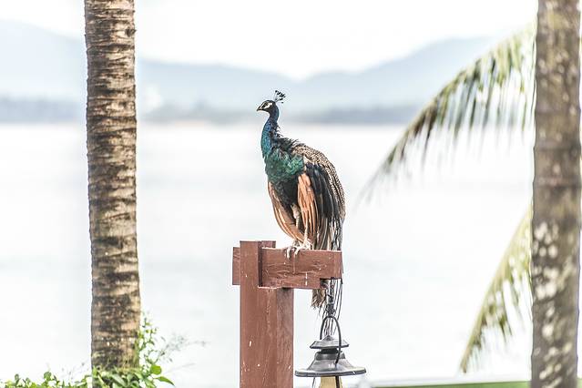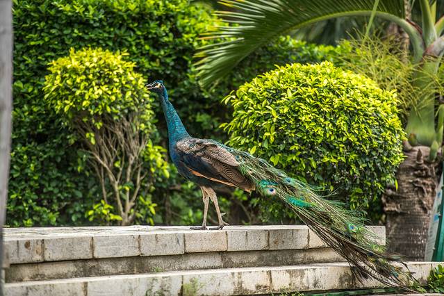这座海岛上还有很多珍稀动物,比如孔雀。蜈支洲岛上的孔雀比较不太害怕人,看到山野君拿相机拍它们没有显出丝毫的畏惧感,而是跟我对视了一下,真的很可爱。这是山野君在下榻的蜈支洲岛酒店的院子里拍到的孔雀。