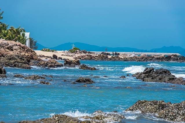 与蜈支洲、亚龙湾和海棠湾不同的是,天涯海角拥有相对比较原生态的风光,海滩的石头呈黑色状,且海水是深蓝色的,在蓝天白云下有一种异国海岛的风情,很美也很壮观。
