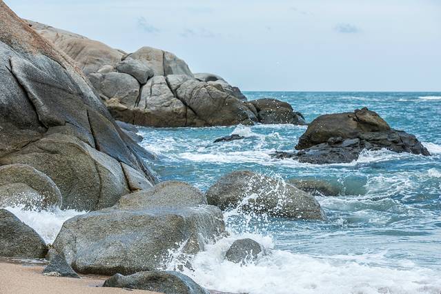 小洞天所在的海滩石头非常庞大,与大海浑然一体。这些分布不规则是巨石成为海陆分界线,在此处与心爱的人手牵着手坐在海滩上慢悠悠地欣赏惊涛拍岸的风景,这是何等的浪漫与温馨呀?此时此刻的山野君已经是情心顿开!