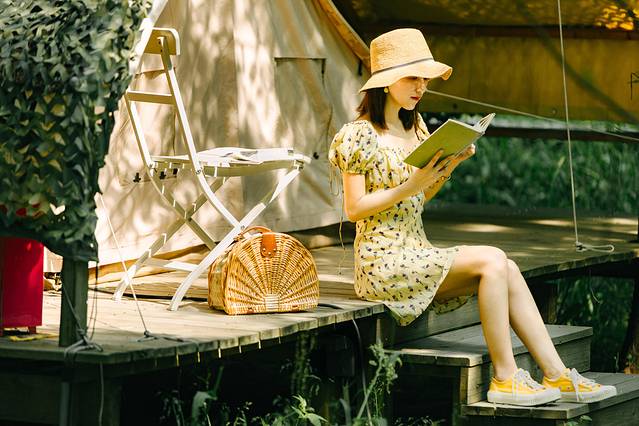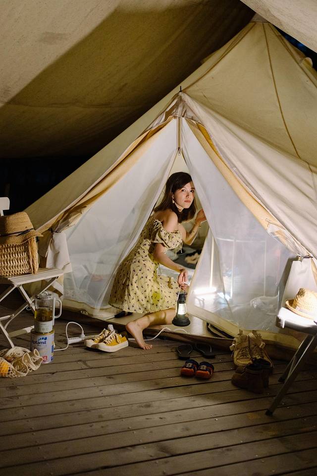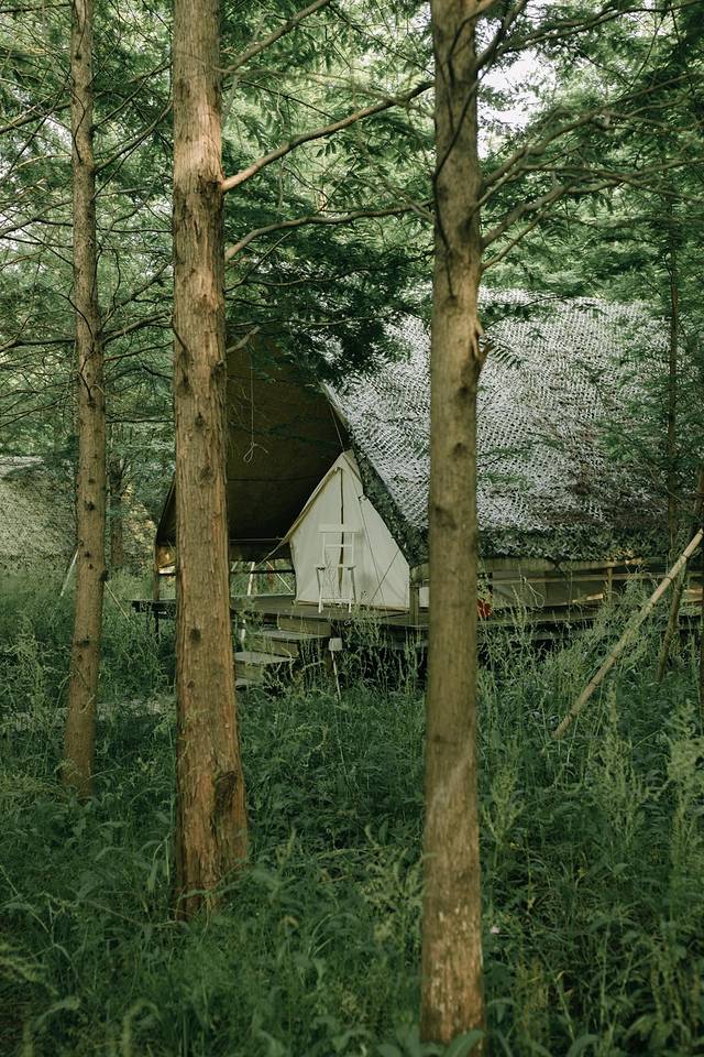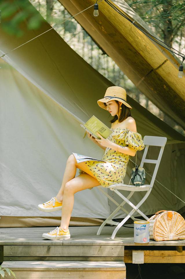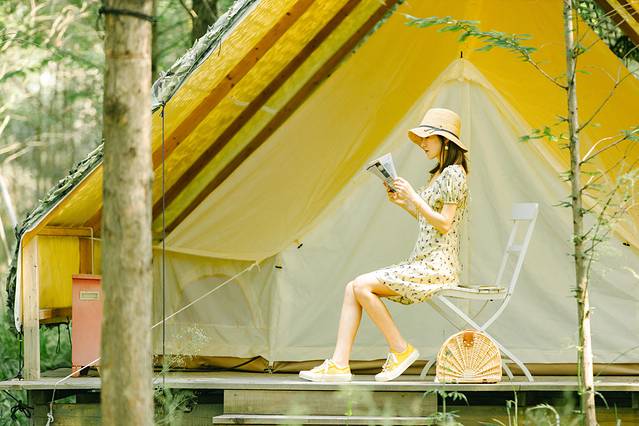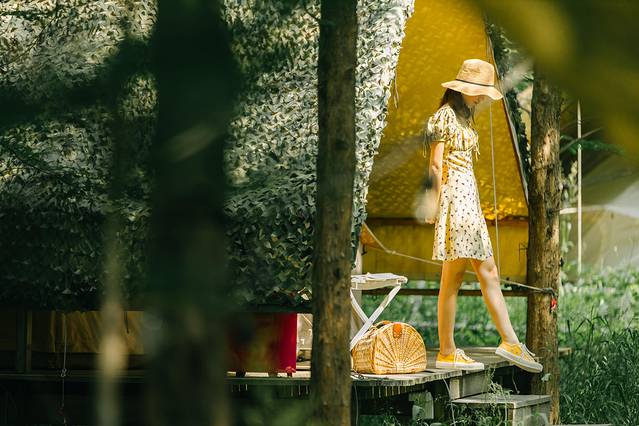 中午时分的太阳还是很强烈,看了一眼天气预报今天居然有36°。其实正午不是拍照的最好时机,阳光太强,光线会很硬。但是还是挡不住想在这里拍拍拍的心情啊!透过树林黄色的阳光,照射在帐篷上,斑斑驳驳的树影,另有一番趣味。绿色和黄色都是我最爱的颜色,活泼又充满希望。