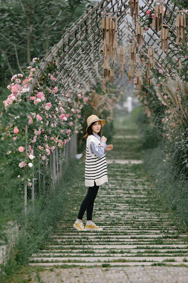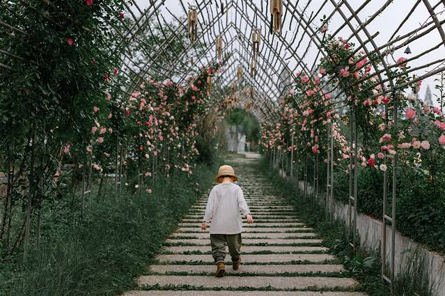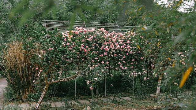 花房的外面倒是有着一片月季花长廊。月季把长廊的篱笆满满的控制住了,相当美丽。