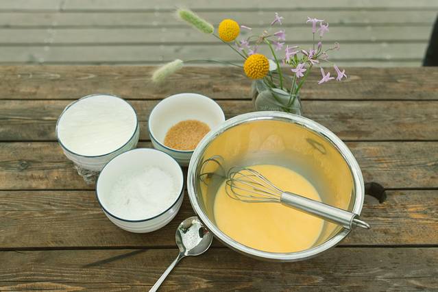 我帮着狍哥把蛋液倒入球中。狍哥仔细的看着,生怕我把蛋液倒漏到外面了。