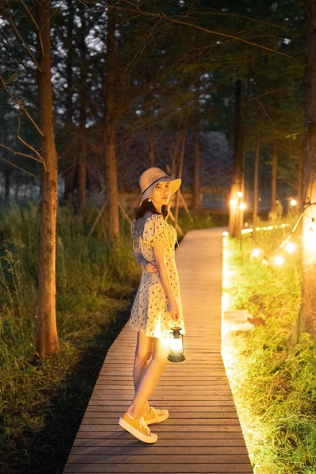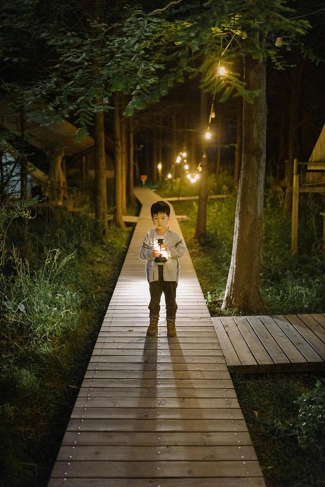 在餐厅吃好回来,天色已暗,森林已经开启了夜幕模式。暖黄色的灯光星星点点。