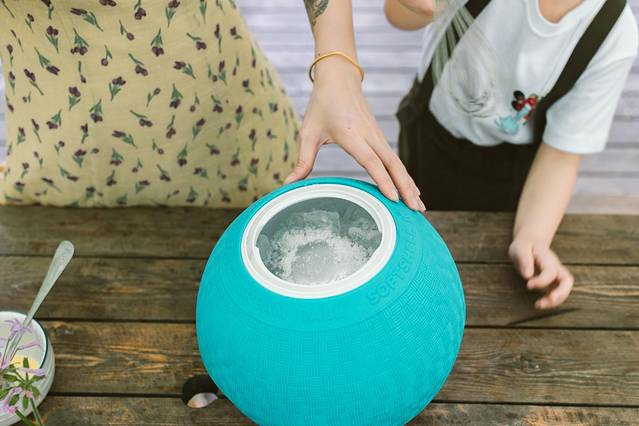 “小朋友说的很好啊~” 工作员姐姐说:“冰块是起到制冷的效果,但是要让蛋液变成冰淇淋,光倒进去是远远不够的呦,我们等下还要进行下一步环节。”