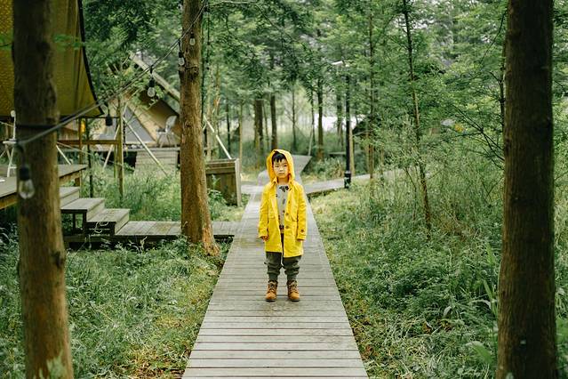 森林早餐是从7点半开始,清早下起了淅沥小雨,有些微凉。今天狍哥不是被闹钟吵醒的,而是森林里的鸟鸣唤醒的,今日的狍哥没有赖床,刷好牙洗好脸,我帮狍哥套了件防雨风衣。
