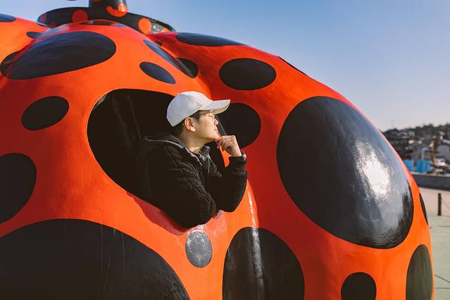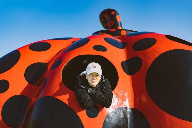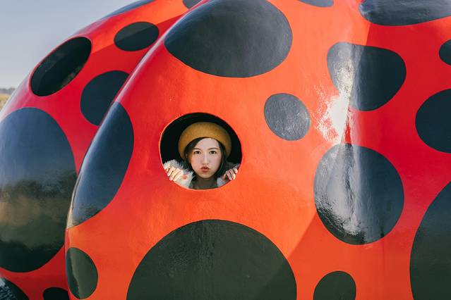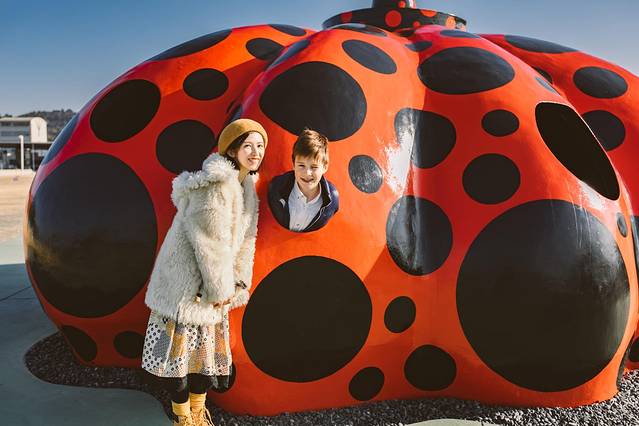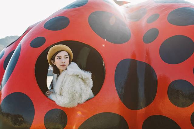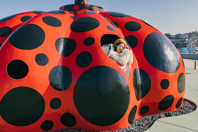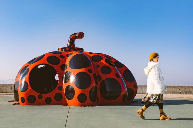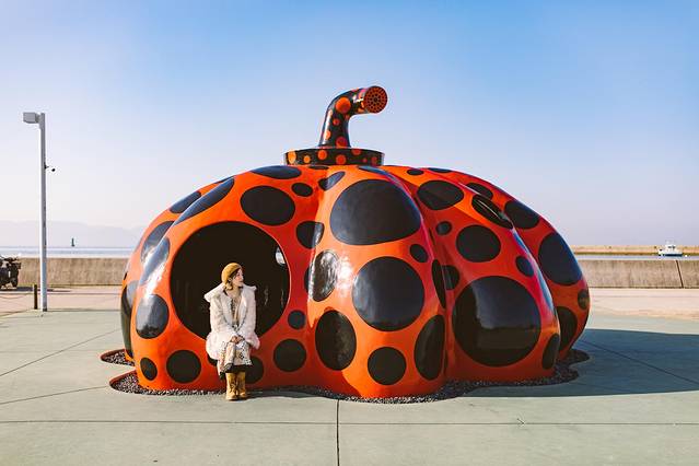 一下船,便能看见位于宫浦港码头体型巨大的红色大南瓜,草间弥生的作品,而且可以钻进去拍照。