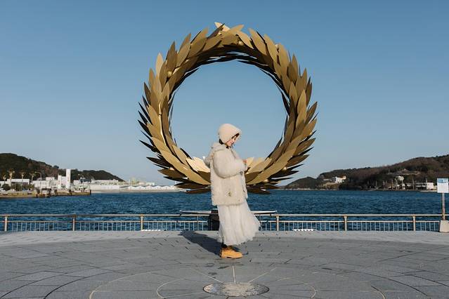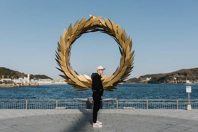 抵达小豆岛,便能看到金色的圆圈雕塑,这是韩国艺术家崔正化,以小豆岛盛产的橄榄树为主题进行创作,金色的叶子既代表了丰收,也代表了阳光。充足的光照给当地带来的丰盛的物产。每一片叶子上都刻有岛上孩子们的留言,是他们对未来的畅想,希望阳光照在叶子上发光的时候,孩子们的梦想也能实现。
