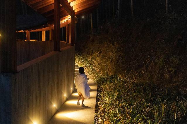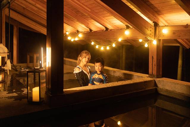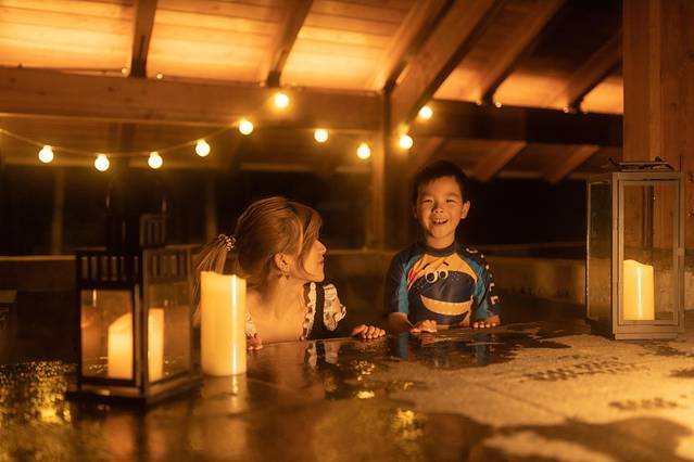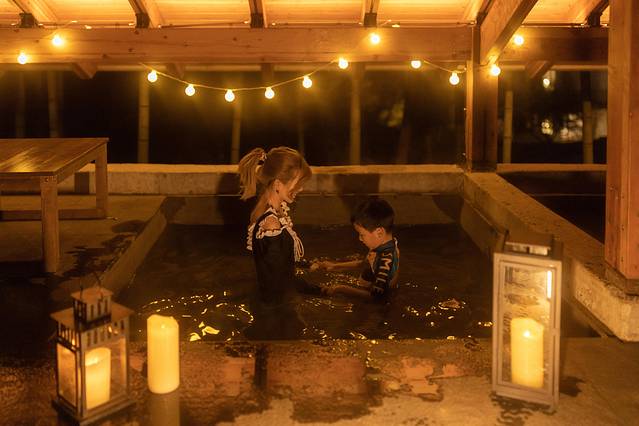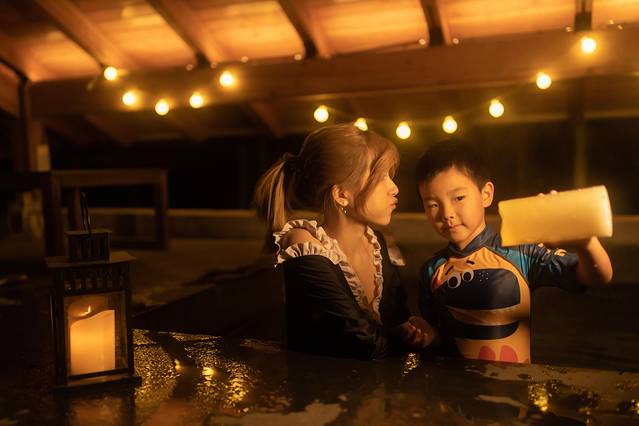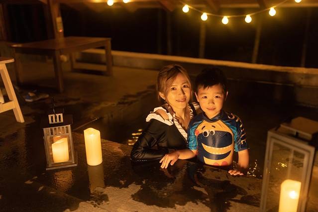 虽然天色已暗,但丝毫也不影响我们边泡澡边看着外面竹影婆娑的美景,点开温泉池周围的蜡烛,暖黄暖黄的灯光,别有一番风味。