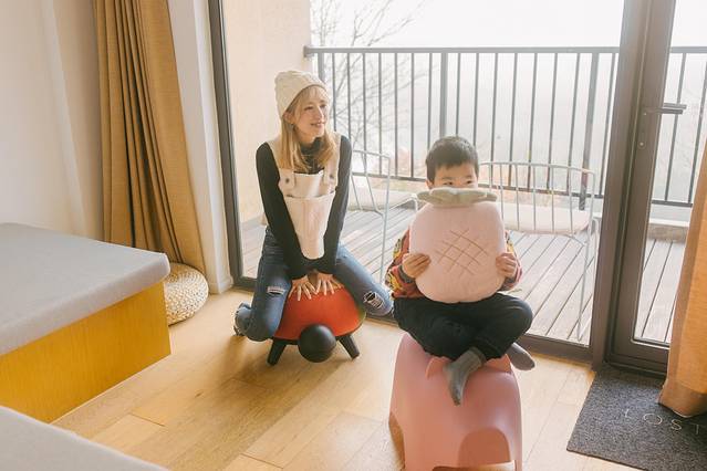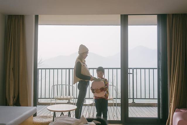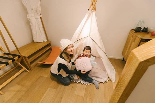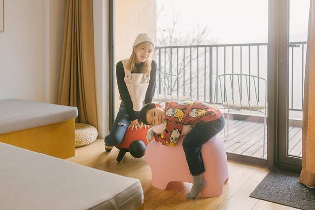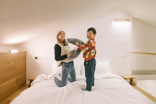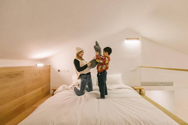 抵达目的地已经是傍晚,民宿的管家小姐姐出来帮我们把行李拎进去,办理好入住手续。今晚我们住的是Loft亲子套房。管家提前帮我们开好了暖气,狍哥一进来就冲到楼上蹦跶了。让我惊喜的是,居然有地暖,这简直是怕冷星人的福音啊!我也光着脚在地上来回磨蹭了一番,真暖和,哈哈哈~
