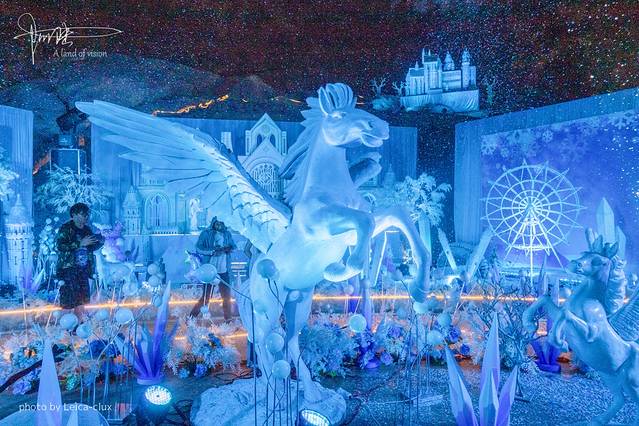以一匹“展翅腾飞”的白马雕塑为主,在瑶琳洞近一千立方米的三厅里,有“城堡”,有“冰棱”,有“雾凇”……总之尽现“寒意”。这里俨然已经成为被夏天遗忘的角落,化作一个童话里才有的冰爽世界。听说本来还有相应的歌舞表演,只是我们运气不佳,并没遇见,太可惜啦。