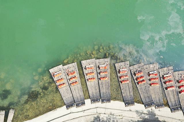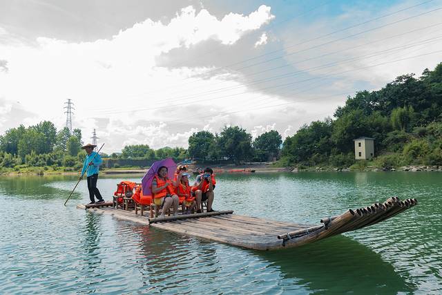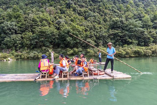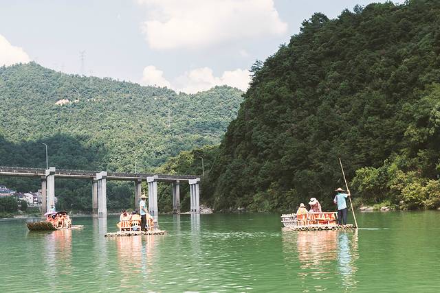 不过,天目溪漂流是竹排漂流,便让漂流多了一份仙气。一个竹排可乘坐9人。船夫持一把竹竿,往水里那么一撑,竹排便前进了几米。转弯、前进,有着行云流水般的熟练。