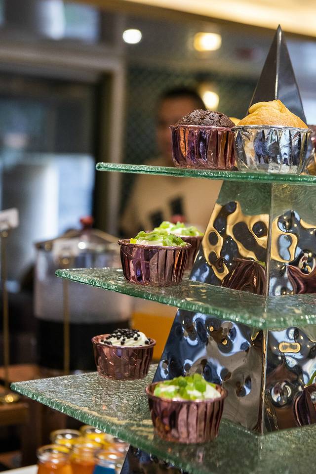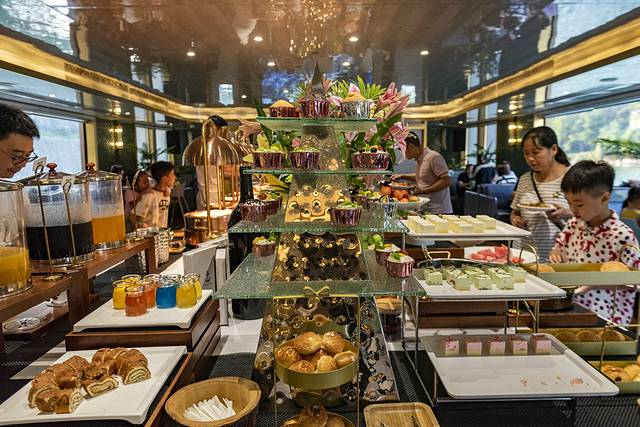 自助餐很丰盛,有寿司、饮品、中餐、西餐、烧烤、海鲜......品种丰富,味道鲜美。游客可一边用餐,一边观赏船外美景。