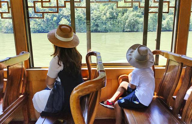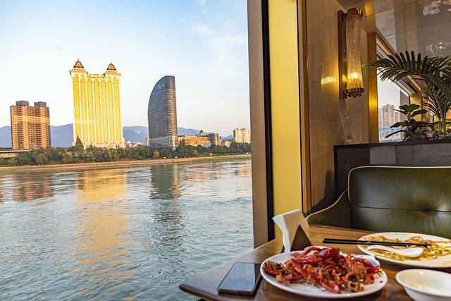 船分三层,一层大厅是座位充足的自助餐厅,二层是雅座和包厢,三层是甲板。当船起航的时候,人们已经在船上大快朵颐了一会儿。