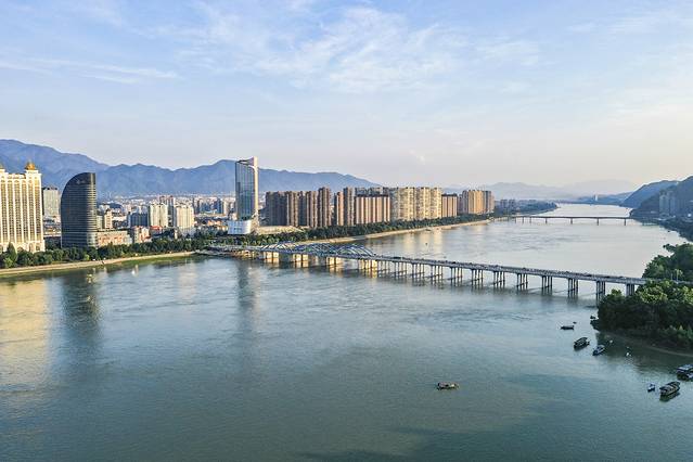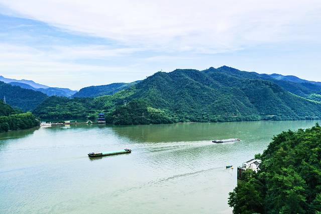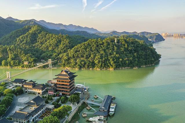 从杭州出发,大约行驶60多公里便到了桐庐县城,一条富春江蜿蜒而过,江面渔船繁忙,江岸两侧风光旖旎。