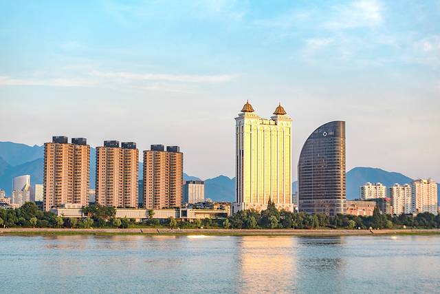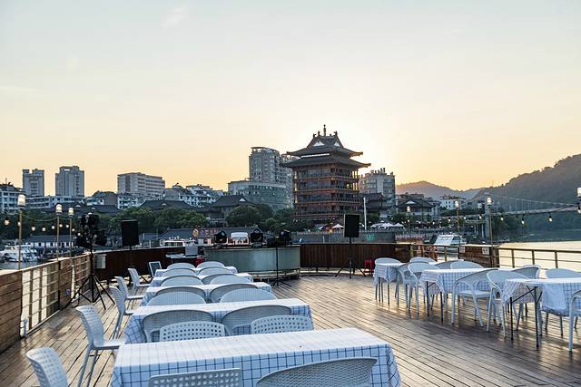 当夕阳逐渐从富春江面上落下,岸边建筑被抹上红晕,时钟指向18:30分的时候,一艘邮轮便从东门码头徐徐起航了。