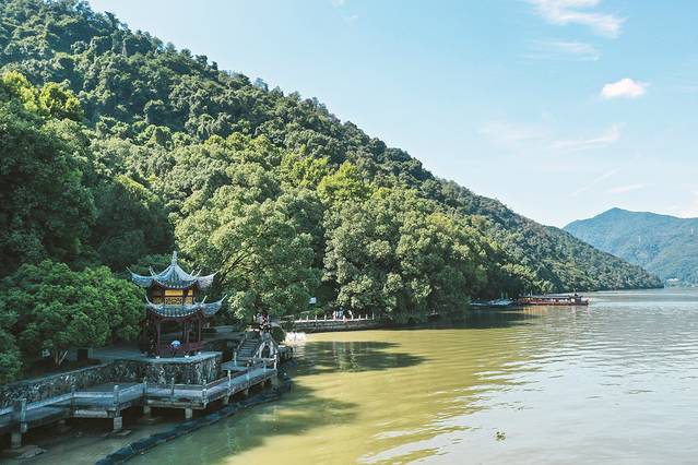 要到严子陵钓台需要先从码头乘船,沿途风光秀丽,青山如黛,果然如名画《富春山居图》。你若仔细观察,会发现实景与画作有许多依稀相同之处。