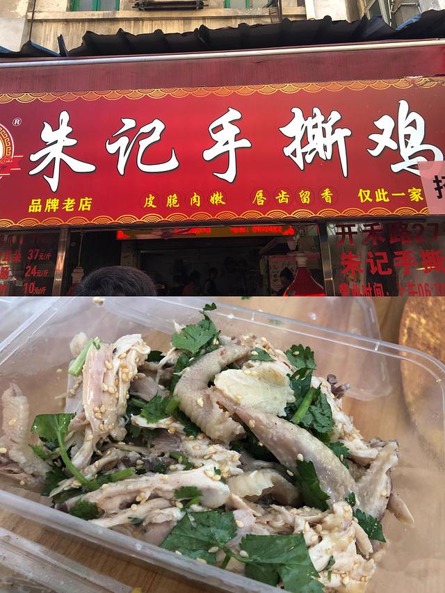 市场的两边入口分别是钟记手撕鸡和朱记手撕鸡,据说朱记更正宗!这家店是一个门脸不大的摊位,下午才出摊,不能堂食。手撕鸡每斤33元,一斤起售,刚好半支鸡,也有其它猪肉熟食售卖。手撕凉拌的鸡肉肉质细腻,油脂适中,鲜美含汁,推荐!