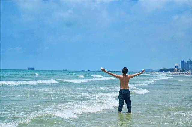 每次看见大海我都会想唱一首歌“大海啊故乡,是我生长的地方!”我从小生活在内陆,见到海的次数屈指可数,北海银滩的美,给我留下了深刻的印象。和别的海滨浴场沙子不一样的是,北海银滩上的沙子都是白的,柔软细腻,一点也不硌脚,很舒服。这里的沙滩由高品位的石英砂堆积而成,洗白,细腻,阳光照耀下,会发出银光。原来银滩的名字是这样来的。
