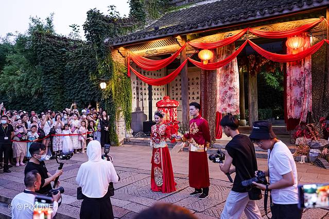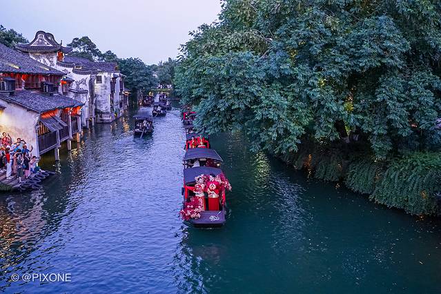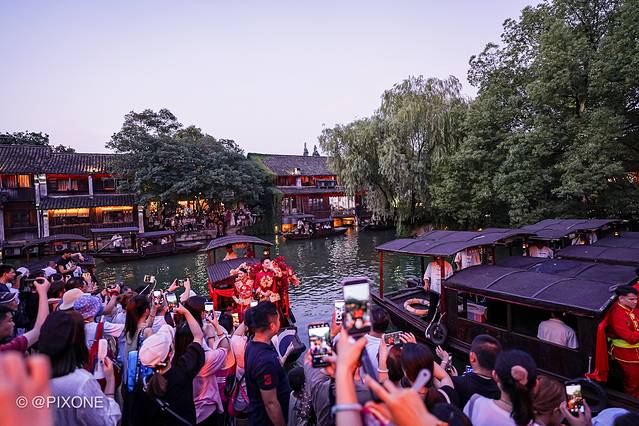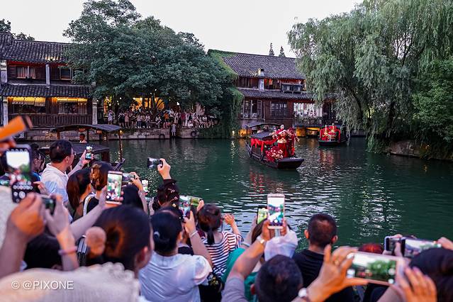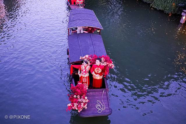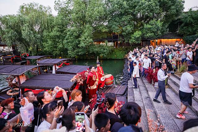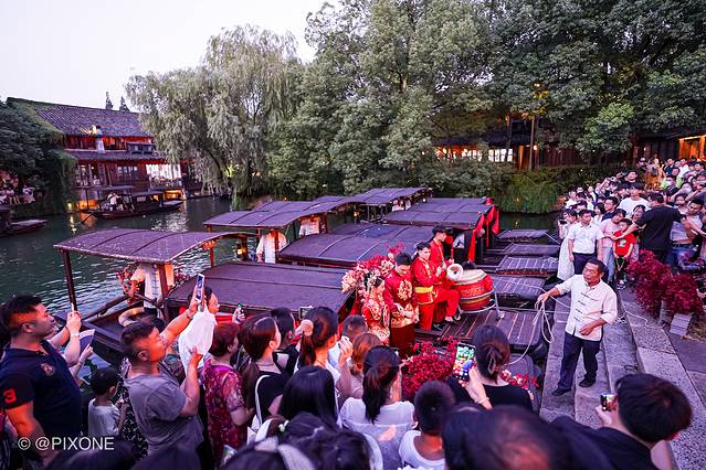 乌镇就复原了以前用船来迎娶新娘的习俗,偶遇一场水乡婚礼秀。在安渡坊码头-灵水居-枕西码头间穿梭,可以说是非常热闹。
