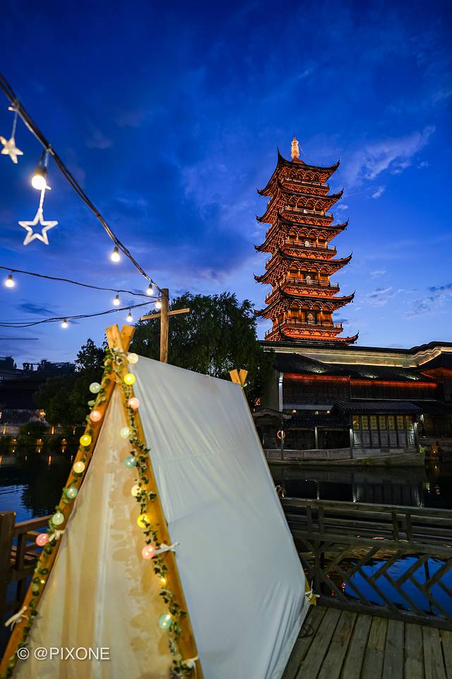 吃过晚饭后就去了夜市,夜市在乌镇标志地-白莲塔边上,与白莲塔隔岸相望。