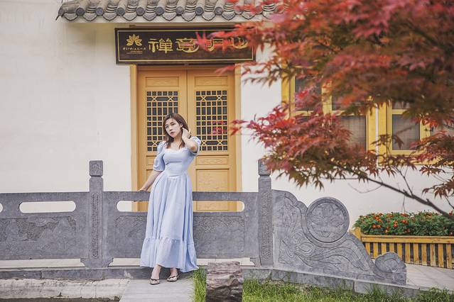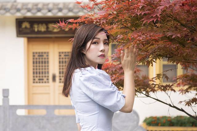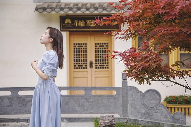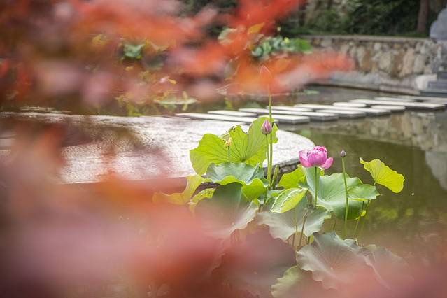 水池边有一棵红枫,在风中轻轻摇曳,透露出禅意。