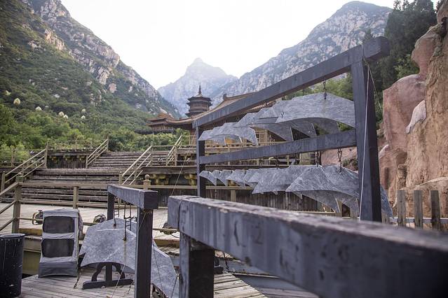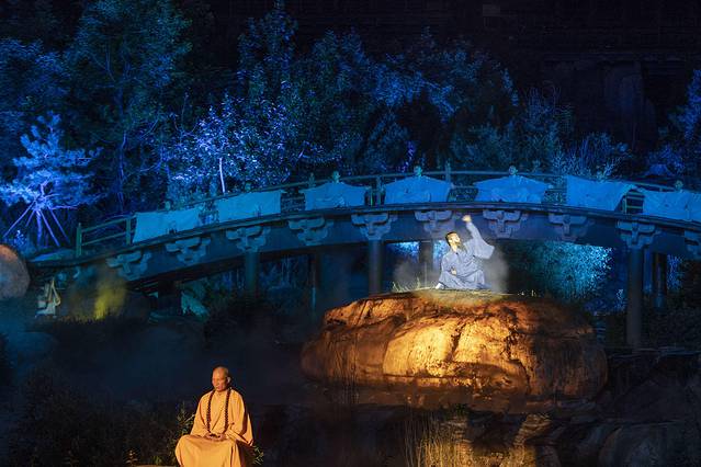 走上主舞台的这座桥,比我想象中要陡。比较有意思的是,昨晚的《水乐·禅境》里,这座桥下和两边是有哗哗的水流的,工作人员告诉我其实山里基本已经没用自然流水了,表演中的溪水都是他们要提前抽水到山上,在表演时才放出来的,这是令我大为震惊,原来做一台演出这么不容易。