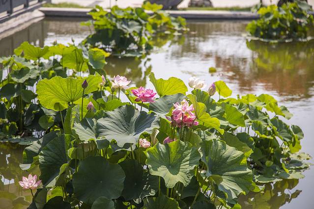我最喜欢的地方是餐厅附近的这一汪水塘,八卦为型,荷花开放,映衬着背后层层的山峦。