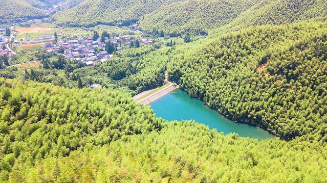 航拍视野,景区游客中心/入口处,掩映在郁郁葱葱的竹海之间,由于霞大线(景区上游漂流道峡谷上方道路)施工未开放,所以今年漂流旺季停车无须担心。停车场一侧(图2右上角)为峡谷野营地。春夏季非常适合野营,这里是个不错的地方,水源、电源、停车位、休息区、WC一应俱全。