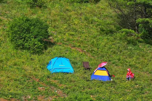 随着交通的方便,这里已经成为人们不出陕西就能体验大草原的乐趣,同时这里海拔高,昼夜温差大,夏季平均气温21°左右,特别适合帐篷露营,每年来这里露营的人数络绎不绝。7月17日当天,这里的路上到处停满了车子。露营帐篷随处可见。