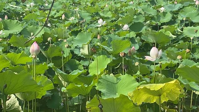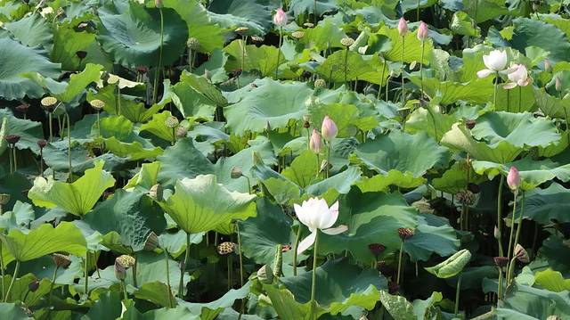 进入荷博园立刻被大片荷花吸引了。走在长廊上,两边分别种植着高杆莲和睡莲。此时,正值荷花的盛花期,池塘里白的、粉的、黄的,各色荷花竞相绽放,让人应接不暇。