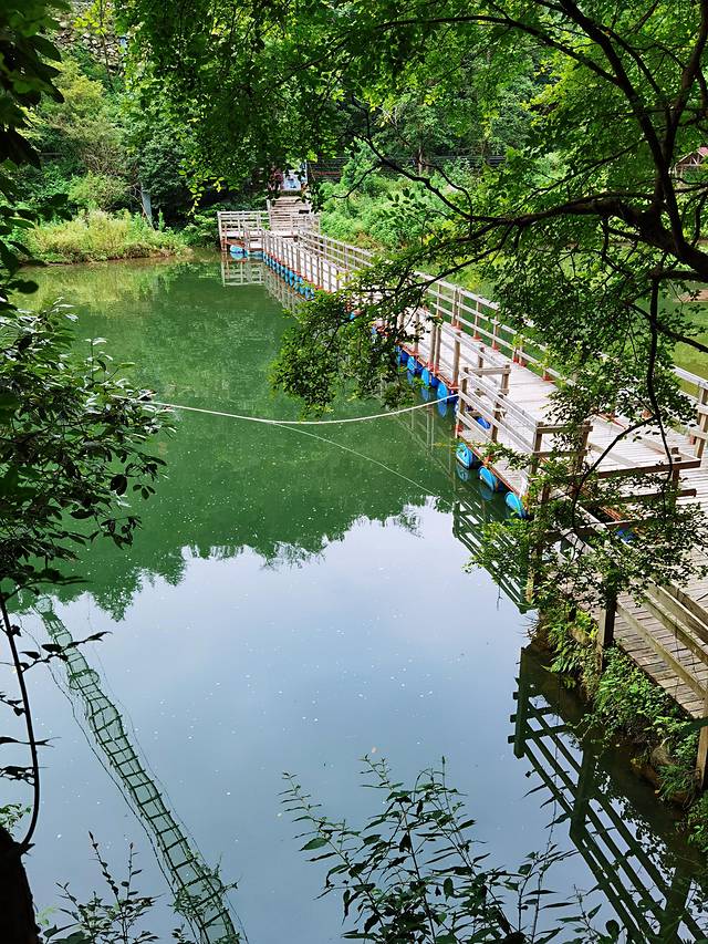 浮桥的上面就是玻璃桥,水下可以看到它的倒影,因为明天我们要去明堂山,玻璃桥我们没上
