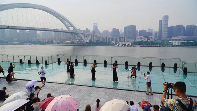 2、悬崖露台(7F):这里是以黄浦江和大桥为背景,可以拍出大都市风。