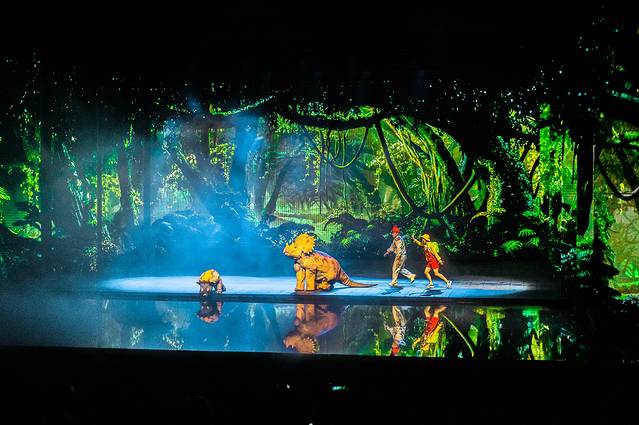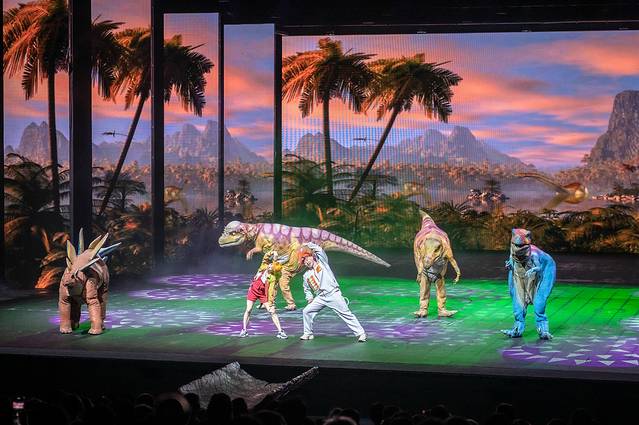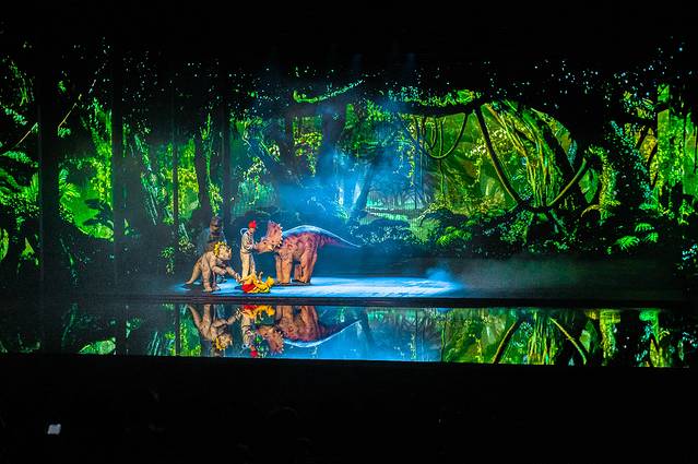 在《WA!恐龙》的亲子秀中,舞台运用了最先进的声光电的高科技配合,这是一场属于艺术与科技的碰撞,带着我们一起穿越到那个时代,与恐龙亲密接触,学习相关的恐龙知识。