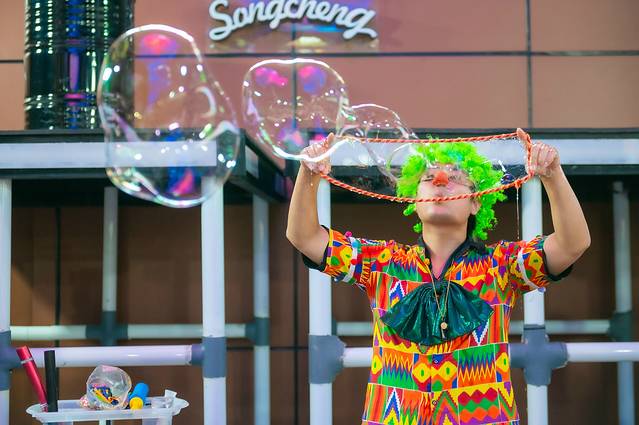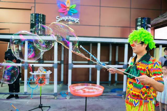 比如滑稽可爱的小丑,带着爆炸头,顶着红鼻子,穿着五颜六色的衣服,做着夸张的表情,为孩子们表演了一场又一场精彩的魔幻泡泡秀。