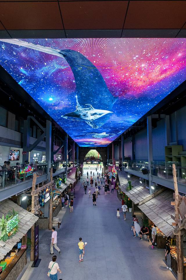 进入景区的魔幻街首先吸人眼球,在街道两旁都是一些特色的小摊,能够看见许多来自以前的复古的零食和小玩意儿,头顶的巨幕大屏,一只只鲸鱼在星空璀璨里遨游,孩子看见眼睛都瞪圆了,张大嘴巴,第一次见到能悬浮在自己头顶的屏幕动画,也是第一次见到能在宇宙中游动的鱼,这勾起了宝宝的兴趣,想象力也得到了启发。