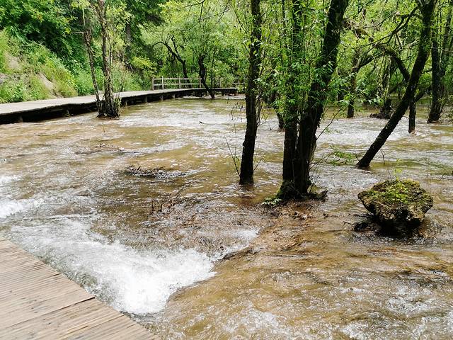 进入林区沿栈道下去逐渐接近瀑布群