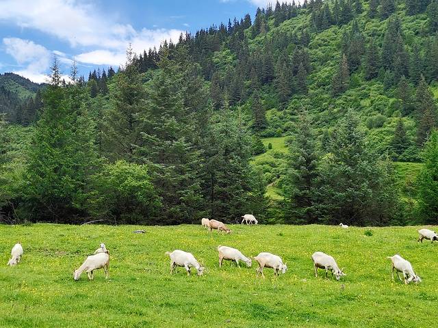 路旁森林前草地上的羊群