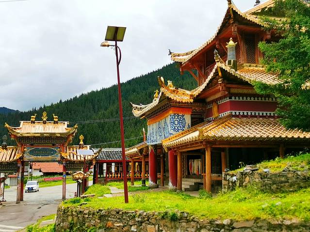 松潘县的牟尼沟景区分为两部分:扎噶瀑布景区和二道海景区,两地相距大约15公里。先去扎嘎瀑布景区游览,这是进入景区路途经过的牟尼后寺。