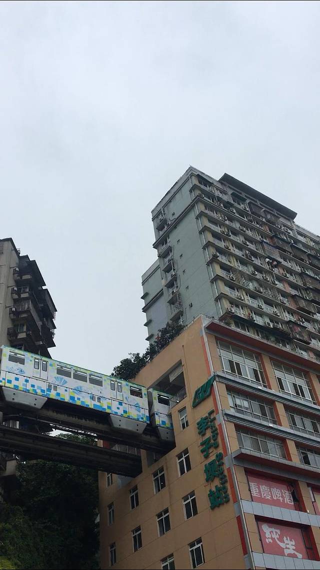 第一,解放碑→李子坝轻轨穿楼。经过一晚的休整,第二天的雨打乱了全部的计划,而且天气预报后面全部都是雨,我们只好改变行程改签回去,在回去之前还有半天时间,我们去了李子坝。直接在解放碑坐地铁前往,其实坐在上面也没啥感受,跟其他城市地铁不同的是一下就出到了外面变成轻轨了,可以看到外面的景色,一路沿着江边到了李子坝,我们下车步行到对面感受轻轨穿楼的壮观场面,在下面看还是很有感觉的,你不由得感叹现代人的智慧和科技的进步。