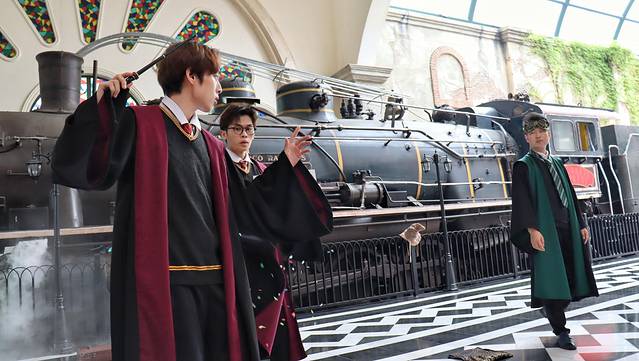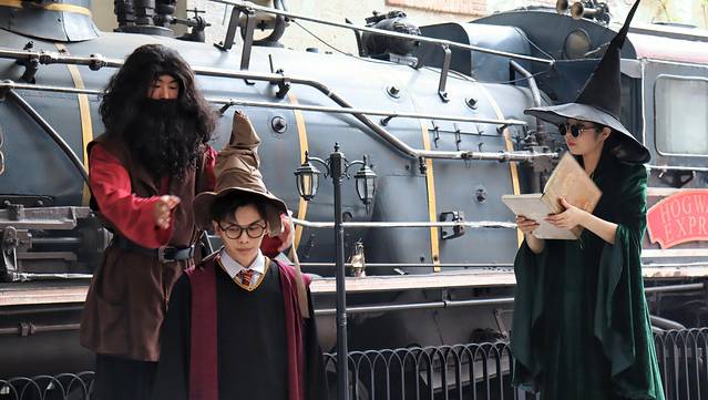 看啊,随着火车鸣笛的声响,9¾站台的蒸汽火车旁,出现了让我们熟悉的身影(哈迷在哪里?)哈利和他的伙伴们来了,与马尔福进行激烈的对决后,他们一起接受了霍格沃茨魔法学校对新生的分院仪式……