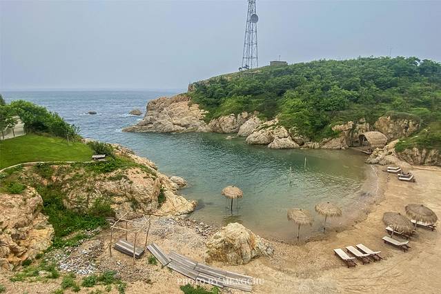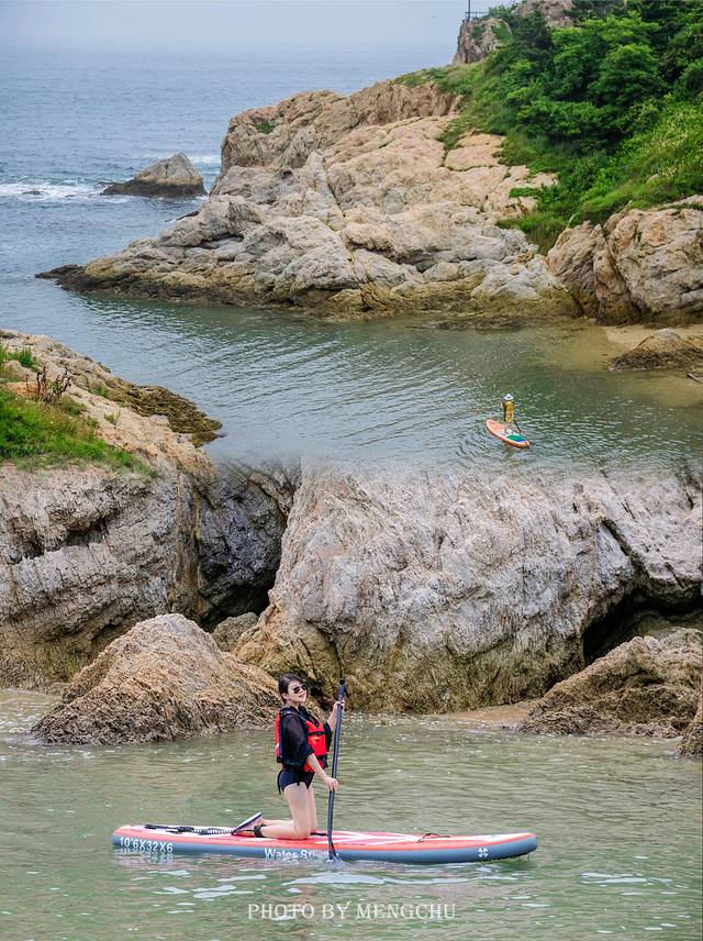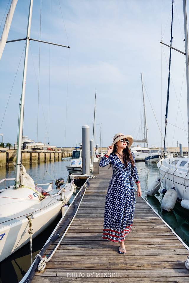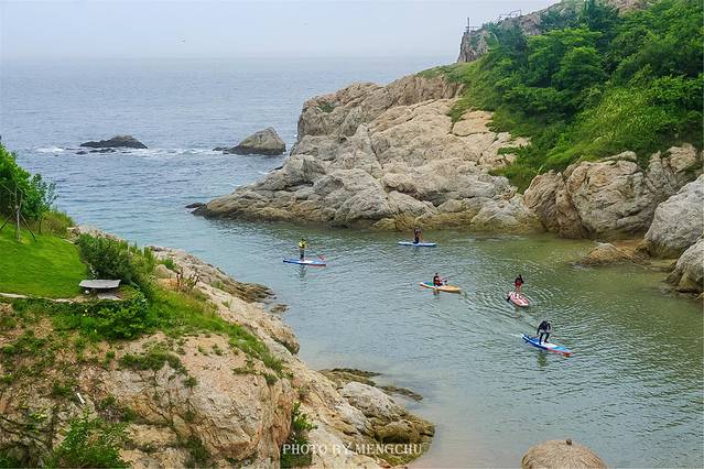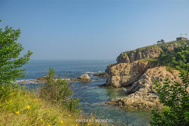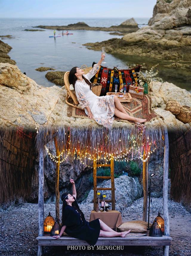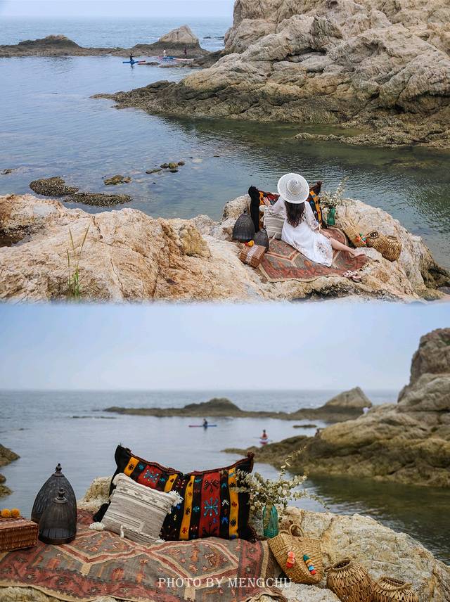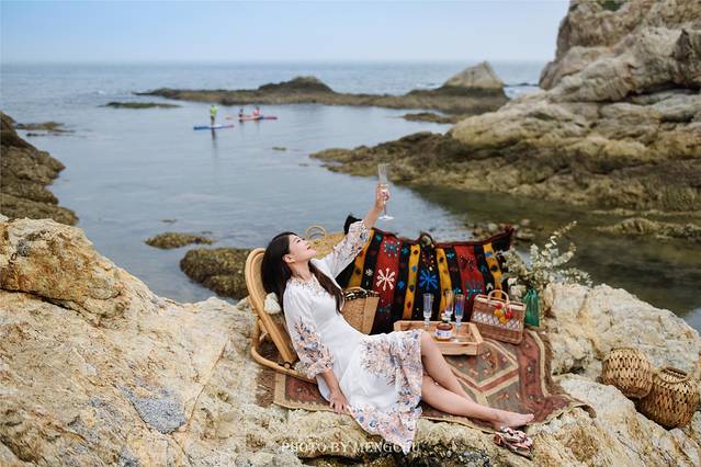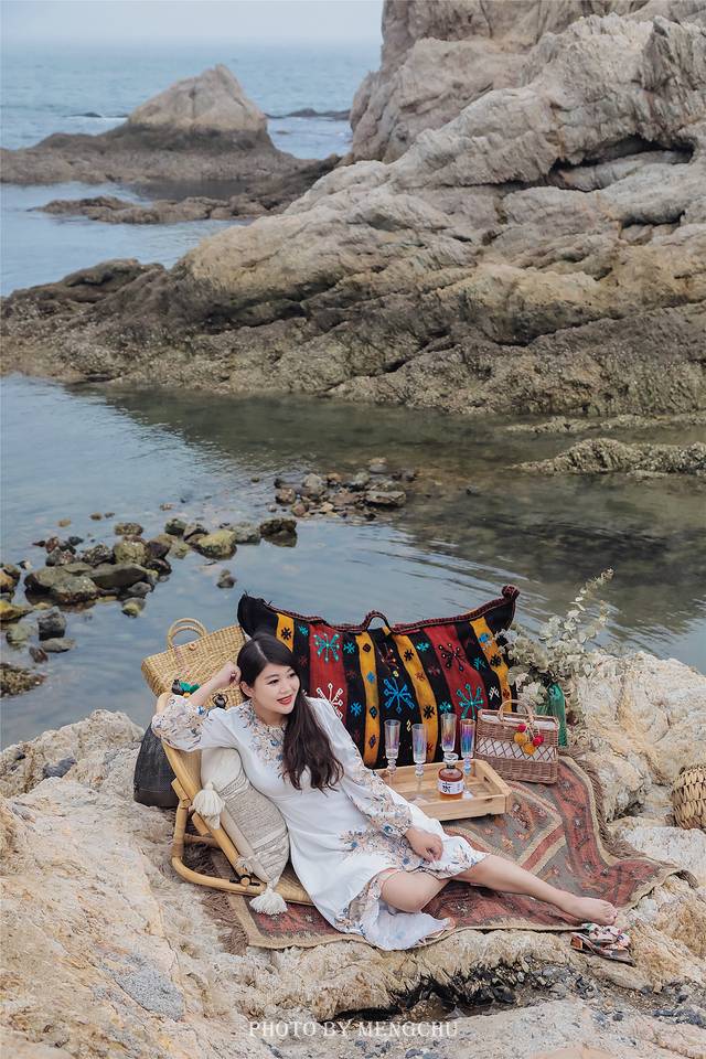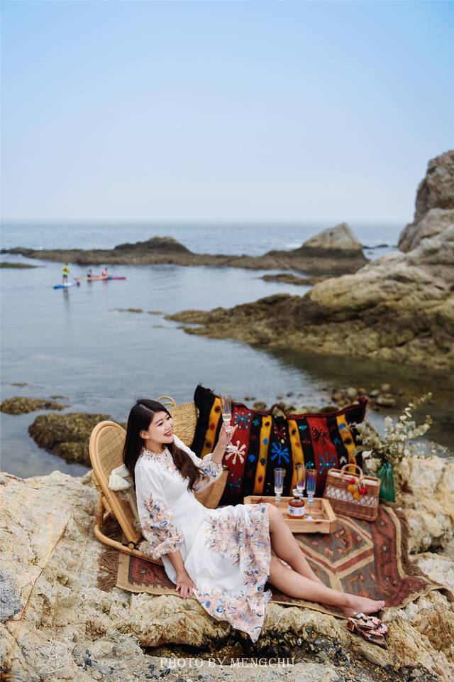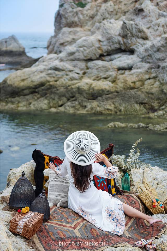 山体的岩壁泛白,沿着礁石攀爬上去,有一处平缓的石台,可以铺好毯子提上野餐篮,感受脚下海浪拍打礁石的那种惬意。在岩壁上拍照,一袭白衣长裙,一顶大沿草帽,背后是翡绿色的海湾,有蓝天白云做衬,仿佛是在摩洛哥的海边。如果我不说,你敢相信这是在大连吗?真的不辜负“中国浪漫之都”这一美誉。
