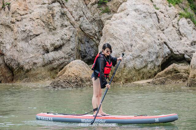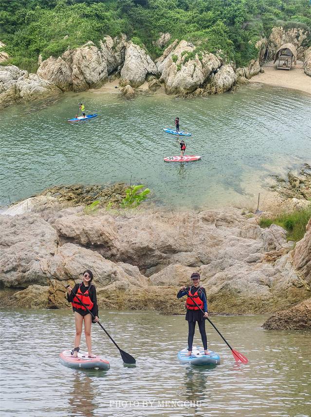 如果你热衷于挑战新事物,不妨尝试一下「桨板野游」。无需远行,酒店的私家海湾里就是最好的体验地点,这一处隐秘的海岬内风平浪静,格外适合桨板初学者。虽然第一次接触桨板有些小小的紧张,但是教练非常耐心地进行讲解,从救生衣的穿着,到动作要领详解,再到落水安全和再次上板…… 在教练的全程指导下,我很快就克服了恐惧,可以顺利的站在桨板上了!果然这项风靡全球的新兴运动很容易让人上瘾啊~ 滑着桨板在翡绿色海面上畅游,感觉仿佛融入了大自然之中。