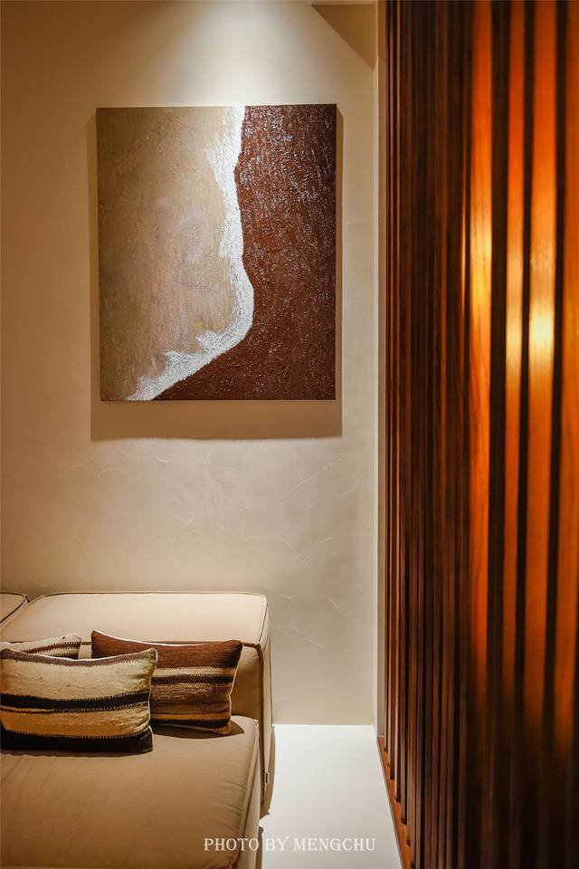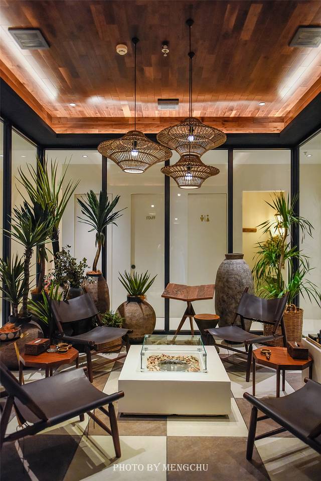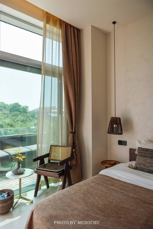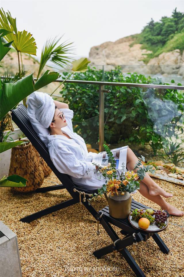 酒店有三层建筑,入口和前台都在二层,中庭有一处玻璃房,原木色的装饰搭配大量绿植,以及各种精致野奢的物件,在自然淳朴中不经意地流露出高级感。一层的房间都是带着庭院的海景房,郁郁葱葱的枝叶是隐秘的天然院墙,靠在躺椅上枕着海浪声,这样慵懒惬意的时光值得慢慢挥霍。三层的房间则是全景海景房,视野极好,推门见海,斜靠在阳台上看这翡色海湾和潮涨汐落,有一种岁月静好的浪漫。