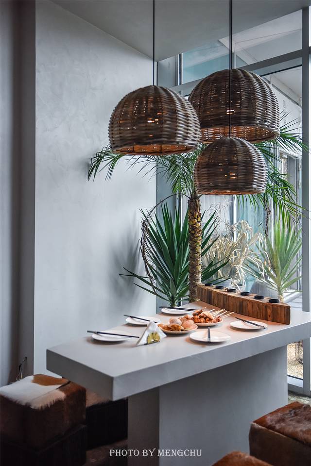 鲸喜餐厅是四时鲸语的下属餐厅,提供丰盛的自助早餐,平日里也对外开放,菜品中西结合,是有着大连风味的融合创意菜。餐厅的设计风格与酒店一脉相承,藤编的布草和绿植的点缀让整个空间充满了侘寂风,而烛台、蓝调与昏黄的灯光又为治理增添了几分浪漫的情调。