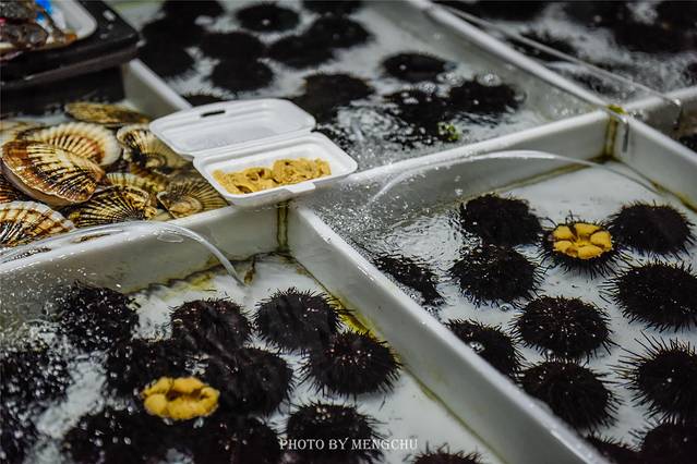 市区的桃源市场代表了大连老城区的风貌,也是这座城市最后的倔强。纵使周围高楼林立,高档小区寸土寸金,而市场中却依旧市井,永远熙熙攘攘。海鲜摊位前永远是人头攒动,三十四个摊位兵分两路左右排开,躁动的飞蟹、肥硕的海胆、锃亮的鲅鱼、挂着海草的海螺……各种叫得出名字的叫不出名字的海鲜在这里鲜活乱跳,而且价格也是便宜得让外地人傻眼。卖海鲜小哥,手脚利落,捞起、称重、装箱、防冰、封箱,一顿操作猛如虎,而双鬓斑白的老奶奶颤巍巍的拿过塑料袋,仔细盘算着是要清蒸还是辣炒,这才是属于大连最迷人的烟火气。