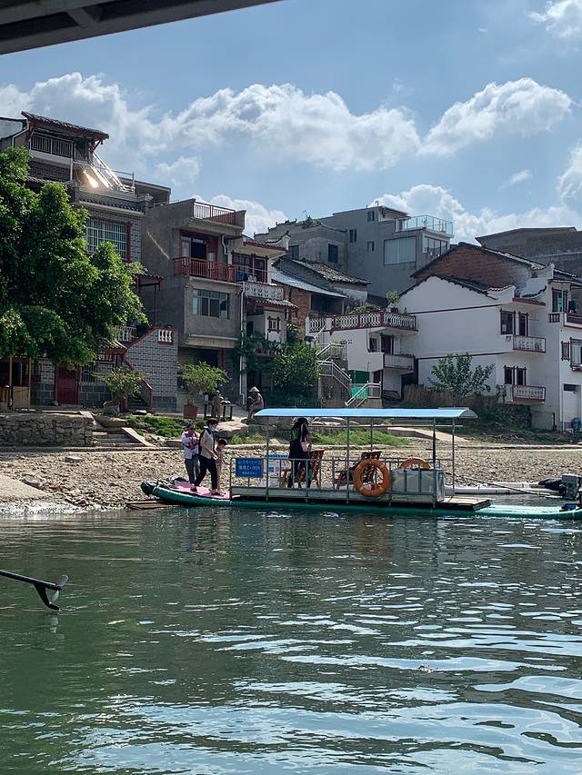 购物店出来去的是大圩古镇,到那排队坐的竹筏,说是竹筏,其实是竹筏后面有发动机,不是人力的。