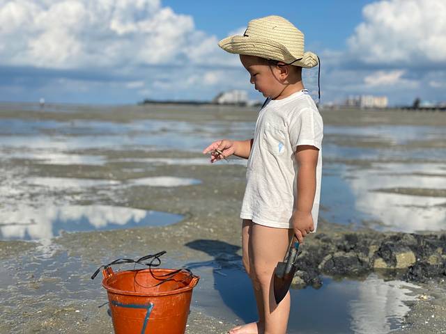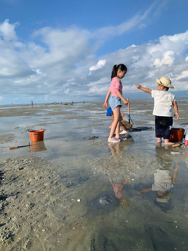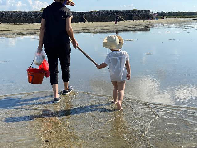 带小朋友的一定要赶海,或许收获的小海鲜不多,但小朋友肯定会很高兴。建议能早一些去,因为我们7点到那的,后面就明显感觉有点晒了,可以提前约好车,一说赶海当地司机应该都知道。自驾的可以导航金海湾红树林。我们是到那租用的工具,老板还会带我们过去,给我们做示范,教我们如何挖。一人好像是40块钱,全套工具:帽子,雨靴,小铲子,小桶。